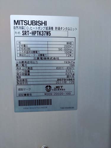 五所川原市唐笠柳 三菱電機自然冷媒CO2ヒートポンプ給湯機 貯湯タンクユニットSRT-HPTK37W5→パナソニック家庭用ヒートポンプ給湯機 ヒートポンプユニットHE-PLS45L エコキュート交換工事