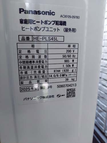 五所川原市唐笠柳 パナソニック家庭用ヒートポンプ給湯機 ヒートポンプユニットHE-PLS45L エコキュート交換工事